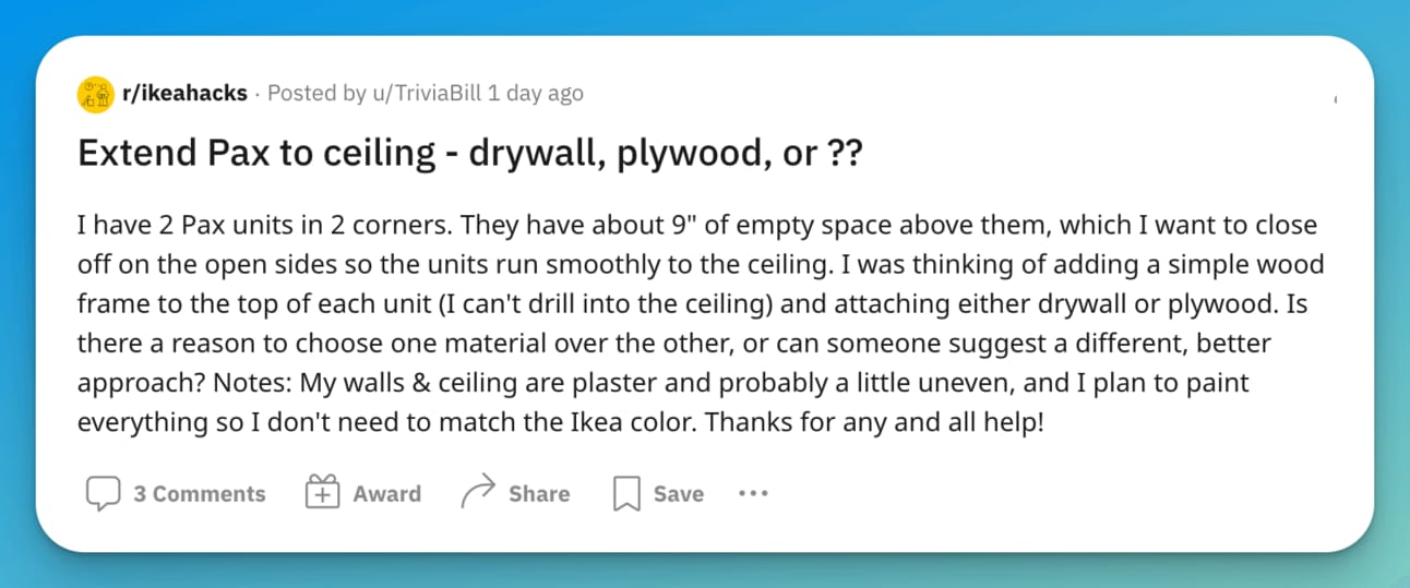 Hey everyone! I saw a question on Reddit about how to extend IKEA Pax units to the ceiling, and I thought I'd share a great approach. Here’s the question…