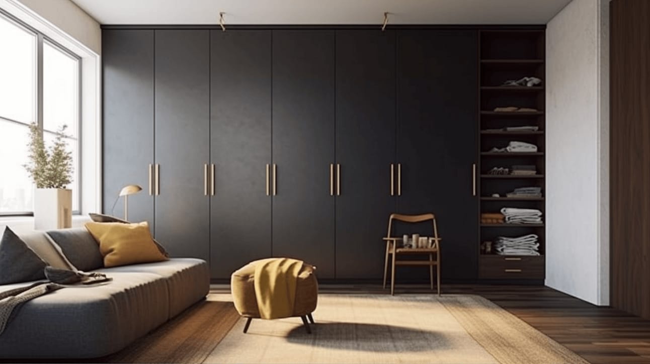 THE IDEA: A built-in Pax wardrobe has been elegantly updated with a rich, dark walnut finish and accented with stylish brass handles.